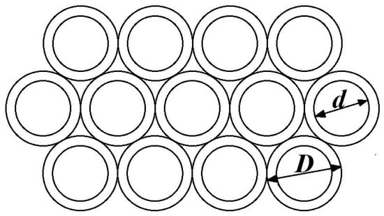 The concept of the permeable breakwater was first proposed by Weigel, who derived analytical solutions for the reflection and transmission coefficients of vertical baffle breakwaters, although the influence of wave diffraction was not considered [4]. Building on Weigel’s work, Cмиphob introduced a local loss resistance coefficient, modified the formulas, and established conditions for their application [5]. Hou proposed a permeable pipe breakwater design consisting primarily of prefabricated pipes with circular sections (see Figure 1). This design minimizes wave pressure on its surface, resulting in high stability [6]. Using wave theory, Li et al. and Shi et al. developed formulas for calculating reflection and transmission coefficients, as well as wave pressure and pressure spectra, for tubular permeable levees interacting with regular waves [7,8,9]. Through various theoretical approaches, Qiu et al. and Ju et al. derived analytical solutions for the transmission and reflection coefficients of single-layer baffle-permeable breakwaters, laying a theoretical foundation for subsequent studies on plate breakwaters [10,11]. Zhu investigated wave reduction and stress characteristics of single-layer vertical baffle breakwaters while considering fluid viscosity [12].