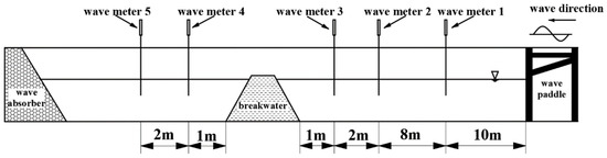 The physical model tests were conducted in a wave–current circulation flume at the Ocean University of China’s hydrodynamics laboratory. The flume measures 30 m in length, 0.6 m in width, and 0.8 m in depth, with a water depth consistently maintained at 0.4 m during the experiments. It is equipped with a wave paddle at one end and an energy dissipation facility at the other. The transmission and reflection coefficients of the breakwater were analyzed using the Goda two-point method, which involves placing two measurement points along the wave propagation direction and recording waveform changes. The Fourier series method was then used to separate and calculate the overall reflection coefficient and the amplitudes of wave components at different frequency intervals for both incident and reflected waves. Five wave altimeters were strategically placed within the flume, as shown in Figure 2. According to the wave model test regulations [52], the physical model tests ensured geometric and gravitational similarity while disregarding mass and center of gravity similarity. A normal model scale of λL = 40 was used to analyze the interaction between waves and models. The study investigated how different breakwater structural parameters and wave characteristics influenced the transmission and reflection coefficients under regular wave conditions. Before conducting the experiments, the wave height meter was calibrated to eliminate potential system errors.