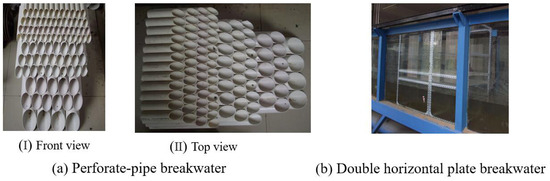 Based on relevant research parameters from Hou [6] (with a pipe outer diameter D of 1.8 m and inner diameter d of 1.0 m), a PVC pipe was chosen for constructing the permeable pipe breakwater model due to its high strength and compressive properties. The pipe diameter increased gradually from top to bottom. PVC adhesive was used to secure the pipes, while screws provided additional reinforcement at three points between pipes of different diameters, as shown in Figure 3a. The model’s dimensions ranged from 0.2 to 2.1 m in length and 0.6 m in width. The length varied according to changes in the top width and slope of the breakwater, while the height was determined by the pipe diameter for different breakwater structures. The tests included three distinct structural configurations: the first consisted of pipe diameters of 32 mm for layers 1–4, 50 mm for layers 5–7, 75 mm for layers 8–9, and 110 mm for layer 10. In the second configuration, the upper pipe diameter was fixed at 32 mm from layers 1 to 7, while it remained the same as the first configuration from layers 8 to 10. Specifically, the pipe diameter was set to 75 mm for layers 8 and 9, and it was increased to 110 mm for the 10th floor. For the third configuration, the pipe diameter was adjusted to be 50 mm from layers 1 to 7, whereas from layer 8 to layer 9, it remains unchanged compared with that in the first configuration. To ensure model height accuracy, it was necessary to remove the PVC pipe from the 10th layer. A double horizontal plate of breakwater with a width of 40 cm and a height of 50 cm was used for comparison. The distance between the two horizontal plates matched the height of layers 1 to 4 in the permeable pipe, as shown in Figure 3b. The experimental groups are presented in Table 1.