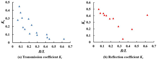The behaviors of Kr and B/L differ, as shown in Figure 4b. Initially, the reflection coefficient Kr of the breakwater decreases as the B/L ratio increases. After reaching a minimum value, Kr increases with further increases in B/L.