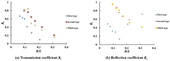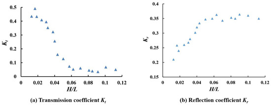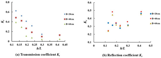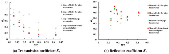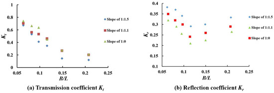 The variation of Kr and B/L for different slopes under the same conditions as Figure 5a is shown in Figure 5b. The comparison of Figure 5a,b reveals that Kr has a similar trend as Kt. The breakwater with a slope of 1:1.5 has the lowest reflection coefficient, while the one with a slope of 1:0 has the highest reflection coefficient.