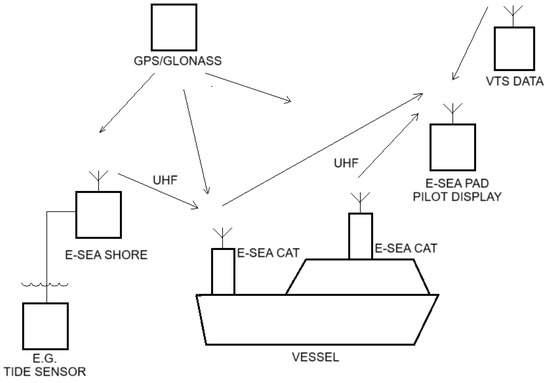 Navigation satellite system with RTK application (own elaboration based on [12]), where: GPS/GLONASS—Global Positioning System/Global Navigation Satellite System, VTS—Vessel Traffic Services, E.G. TIDE SENSOR—exemplary tide parameters sensor, E-SEA CAT–receiver of the satellite and reference station signals.