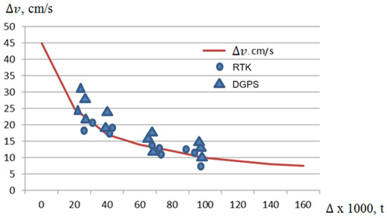 Speed of ships contact with quay fenders during mooring operations depending on ships’ displacement, where red line—calculated speed of ships contacts with fenders, dots—data received using RTK application, and triangles—data received using DGPS.