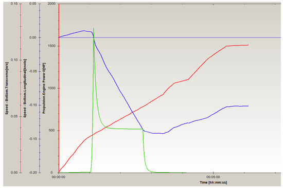 Parameters of POST PANAMAX tanker movement during mooring operation using RTK system (own elaboration based on [12]), where red line—transverse speed, m/s; blue line—longitudinal speed, knots; green line—propulsion engine power, HP.