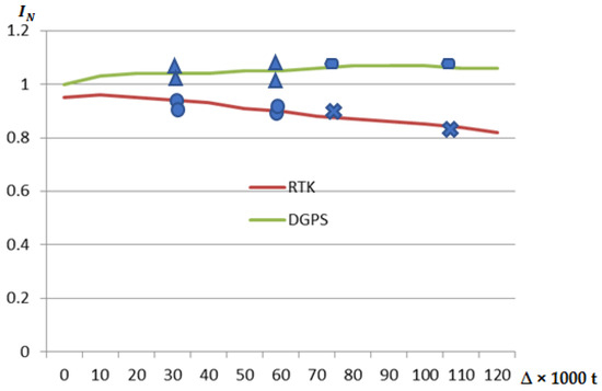 Comparative index calculated based on data achieved using RTK application (red line) and DGPS (green line) and based on experiments on real ships depending on ships displacement, where triangle—results achieved for bulk cargo ships using data provided by DGPS; circle—results achieved for bulk cargo ships using data provided by RTK application; hexagon—results achieved for container ships using data provided by DGPS; cross—results achieved for container ships using data provided by RTK application.