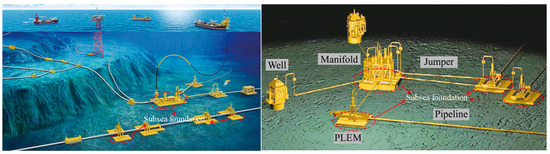 Sandwich composite plates are widely used in many industrial applications such as the aerospace manufacturing, marine, and machinery fields. In the engineering environment, these structural elements are frequently exposed to erratic loads like ocean waves, wind, and noise. Prolonged vibration can lead to fatigue failure, which can jeopardize structural safety. Thus, from a practical design perspective, it is essential to understand their vibration properties [1,2,3,4,5,6,7,8,9,10]. A spring-supported structure is formed by a sequence of independent linear elastic springs in the Winkler–Pasternak model. When examining how structures like buildings, bridges, and machine foundations behave, the Winkler–Pasternak model is especially helpful. It makes it possible for engineers to thoroughly examine a structure’s performance and safety in actual soil situations. For instance, in marine structures, the bottom bases of subsea structures (such as the subsea foundations in Figure 1) can be represented as plate structures resting on a Winkler–Pasternak foundation, which can take into account the Winkler spring stiffness of the seabed in the vertical direction and the Pasternak model for resistance to horizontal shear deformation [11]. The Winkler–Pasternak foundation can more accurately evaluate the dynamic characteristics of marine subsea plate structures with soil–structure interactions.