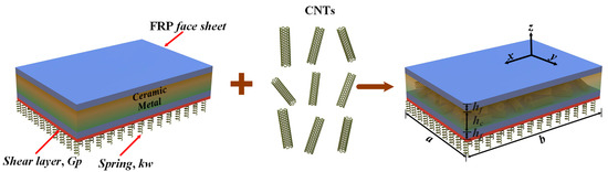 In this paper, a rectangular sandwich composite plate in a Cartesian coordinate system (x-y-z) with two fiber-reinforced plastics (FRP) face sheets and a novel hybrid composite core is considered. The hybrid core consists of carbon nanotube-reinforced composites (CNTRCs) and metal–ceramic functionally graded (FG) matrix. Winkler and Pasternak foundations support the sandwich plate, which has dimensions of a, b, and h. Furthermore, the core and face sheets have thicknesses of hc and hf, respectively. The schematic diagram of the structure is shown in Figure 2.