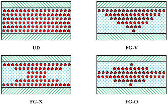In this research, four types of CNT distributions (UD, FG-V, FG-O, and FG-X) along the thickness direction of the intermediate layer are investigated, as seen in Figure 3. The volume fractions of CNTs with different distribution types are shown in Equation (2a–d):