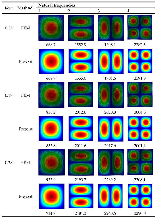 Since there are no available literature results on the novel hybrid composite plates for comparison, the present results with different CNT volume fractions are compared with finite element ones. Moreover, Reddy shear shape function is also used for comparison. Results based on the aforementioned methodologies are shown in Table 7 (comparisons of the mode shapes are shown in Figure 4). The correctness and viability of the current model are demonstrated by the good agreement between the frequencies and other data.