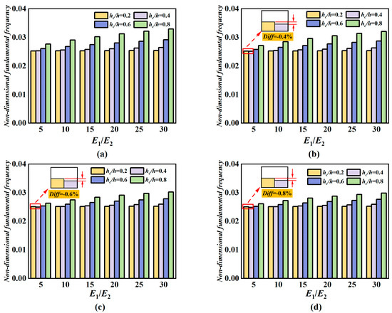 The variation in natural frequency with Young’s modulus ratio (E1/E2) under the ratio of core thickness to boundary thickness (hc/h). (a) p = 0.5, (b) p = 1, (c) p = 5, and (d) p = 10.