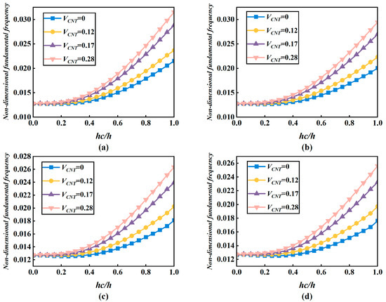- It can be clearly observed that the dimensionless fundamental frequency of the sandwich composite plate increases significantly with the increase in hc/h, indicating that the FG-CNTRC core layer mentioned in this paper can enhance the stiffness of the plate well.