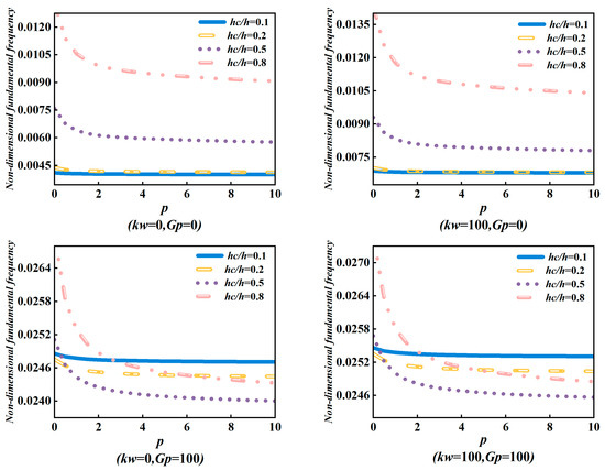 Figure 7 shows how the dimensionless fundamental frequency of sandwich plates varies with changes in the gradient index, core thickness ratio, and elastic stiffness parameters. The sandwich plate is 0.1 m thick. This image illustrates how the fundamental frequency rapidly decreases for small graded indices and decreases with an increase in the gradient index p. The reason behind this phenomenon is that the elastic modulus decease with the increase in graded indexes, and this leads to the decrease in bending stiffness of the whole sandwich plates. In addition, the dimensionless fundamental frequency significantly increases with core thicknesses, indicating that the hybrid composite core can significantly improve the structural stiffness. Additionally, Figure 7 shows that the dimensionless fundamental frequency of the sandwich plate rises as kw and Gp grow, but that kw has little effect on the sandwich plate’s vibration frequency. And the dimensionless fundamental frequency of the sandwich plate is greatly impacted by the increase in Gp. The sandwich plate’s dimensionless fundamental frequency rises noticeably with increasing Gp. Furthermore, thinner core plates exhibit larger dimensionless fundamental frequencies at Gp = 100 compared to Gp = 0 for lower gradient indexes.