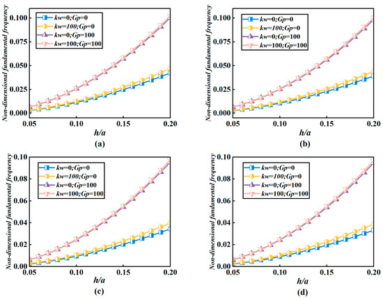 Figure 8 examines the effects of gradient index, elastic parameters, and thickness-to-width ratio on the sandwich plate’s dimensionless fundamental frequency. The ratio of thickness is hc/h = 0.8. Because of the thin plates, the bending stiffness and fundamental frequencies rise with overall thickness, as shown in Figure 8, which shows that the dimensionless fundamental frequency steadily increases as the thickness to width ratio rises from 0.05 to 0.2. Additionally, Figure 8 shows that as kw and Gp grow, the sandwich plate’s vibration frequency rises, but kw has less of an impact on the sandwich plate’s dimensionless fundamental frequency. Additionally, as Gp increases, the dimensionless fundamental frequency will rise noticeably.