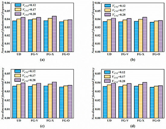 - For different distributions of CNT (UD, FG-V, FG-X, FG-O), the FG-O distribution significantly reduces the dimensionless frequency, while the remaining three distributions have no significant effect on the dimensionless frequency.