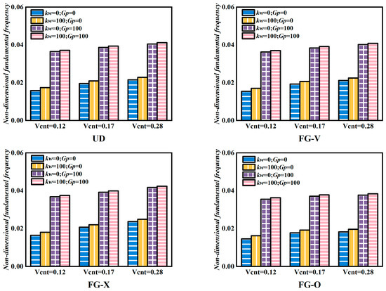 The effect of elastic foundation parameters on the sandwich plate’s dimensionless fundamental frequency is investigated in Figure 10. The distribution types and volume proportion of CNTs are taken into account. Generally speaking, when the volume percentage of CNTs rises, the dimensionless fundamental frequency rises noticeably, demonstrating that CNTs increase the material’s rigidity. It is also observed that the dimensionless fundamental frequency increases with an increase in kw and Gp. However, the impact of kw on the dimensionless fundamental frequency is less, and the increase in Gp significantly increases the dimensionless fundamental frequency. Moreover, in good agreement with expectation, among the four distributions, FG-O has the relatively smallest dimensionless fundamental frequency and FG-X has the relatively largest dimensionless fundamental frequency.