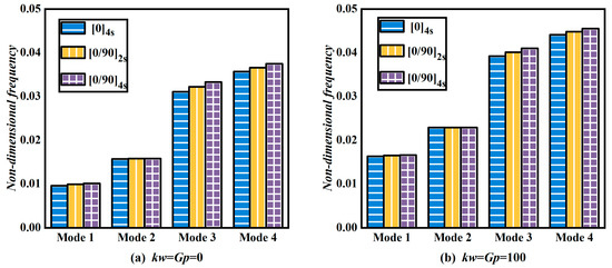 Figure 11 investigates the effect of fiber’s various lamination schemes and elastic foundation parameters of the plate on the first four dimensionless free vibration frequencies of the sandwich plate. It should be noted that the influence of different lamination schemes has little effect on the first two dimensionless frequencies, but as the order increases, the differences in the dimensionless frequencies of the different lamination schemes become progressively more pronounced. In the last two free vibration frequencies, the dimensionless frequency is highest when the lamination scheme of the fiber is [0°/90°]4s and is lowest when the lamination scheme of the fiber is [0°]4s. In addition, in agreement with the previous cases, the dimensionless frequencies significantly increase with the increase in the elastic foundation parameters kw and Gp.