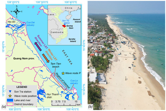 Vietnam boasts a coastline stretching approximately 3260 km, which plays a significant role in the country’s geography, economy, and culture [11,12]. The coastal region of Vietnam is particularly susceptible to shoreline alterations. The coastline is home to over half of the nation’s significant urban centers and approximately one-third of the total population. Climate change and natural hazards exacerbate the adverse effects of shoreline erosion, making the region more vulnerable due to the concentration of people and infrastructure in coastal areas [13]. In particular, the central region of Vietnam constitutes a dynamic and pivotal economic hub within the nation. This region has a coastline stretching approximately 600 km, which indicates complicated topography and geological features [14]. It has experienced extensive damage from various natural disasters, e.g., typhoons, flooding, and even tsunamis resulting from earthquakes in the East Sea. Within the diverse coastal regions of Central Vietnam, our research concentrates on the shoreline of Quang Nam province, with a particular focus on the segment adjacent to Tam Tien Beach (Figure 1). The region is facing significant coastal erosion, posing a substantial threat to the safety, property, and livelihoods of local residents. As highlighted by Quang et al. (2021), the coastline of Quang Nam has experienced notable changes over the past three decades, with both erosion and accretion occurring in varying patterns over the Nui Thanh district [15].