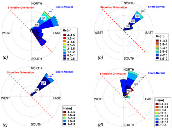 Wave roses derived from the ERA5 reanalysis dataset for the period 2015–2022 at node P: (a) all Hs; (b) Hs ≥ 1 m; (c) Hs ≥ 2 m; (d) Hs ≥ 3 m. The ranges corresponding to Hs ≥ 3 m, 2 m, and 1 m include the top 0.05%, 2.9%, and 24.3% of the wave record, respectively; Hs ≥ 3 m corresponds roughly to the wave event with the largest significant wave height of the year.