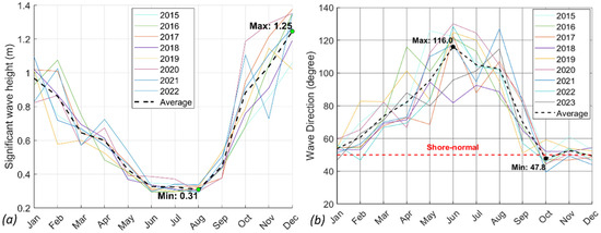 Figure 3a illustrates distinct seasonal variations in the monthly mean significant wave height, while Figure 3b shows the corresponding changes in wave direction. The figure demonstrates the substantial influence of the monsoon seasons on wave dynamics in the area. During the summer, the SW monsoon leads to a decrease in wave energy, reaching a minimum height of 0.31 m. In contrast, the winter NE monsoon causes a notable increase in wave energy, with wave heights peaking at 1.25 m. Waves during the winter monsoon primarily originate from the northeast–east direction, with heights ranging from 1 to 2 m. In summer, the SW monsoon brings waves predominantly from the south–southeast direction. The asymmetry in wave height between these dominant directions contributes to seasonal variations in longshore sediment transport (Figure 1a).