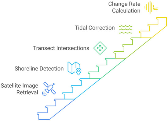 The CoastSat toolkit [16], a robust and open-source solution compatible with Python 3.6 and later, has been extensively utilized to assess spatial and temporal shoreline dynamics [22,23]. By integrating Google Earth Engine functionalities, it facilitates the accurate delineation of global coastlines [16]. Figure 4 illustrates the steps involved in shoreline monitoring using the CoastSat toolkit (v2.1).