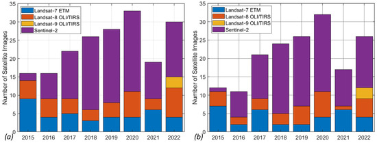 Number of acquired satellite images within the study area: (a) retrieval from GEE; (b) after discarding due to cloud cover over the shoreline.