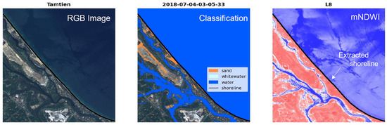 where Green and SWIR are the pixel values from the green band and short-wave infrared band, respectively [24]. This results in a grayscale (i.e., single-color band) image with values ranging from −1 to 1. A sand/water threshold is automatically determined using Otsu’s thresholding method [25], which is applied exclusively to pixels previously classified as either water or sand. This thresholding technique facilitates the identification of the shoreline at a sub-pixel level. An example of the shoreline extraction procedure is illustrated in Figure 6.