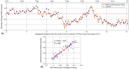 Quantified shoreline change rates during 1990–2019: (a) alongshore variations in LRR derived from CoastSat and DSAS; (b) scatter plot of LRR obtained by CoastSat and DSAS analyses.