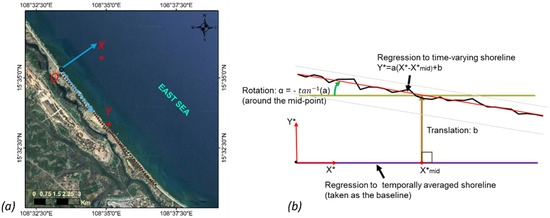 Initially, the temporally averaged shoreline position was calculated for 60 transects over the study period, represented by the red points in Figure 9a. A linear regression line, shown as the red line in Figure 9b, was then fitted to these mean positions. To facilitate further analysis, a new coordinate system was introduced, with the X*-axis aligned along the regression line of the mean shoreline locations and the Y*-axis oriented perpendicular to it (Figure 9a). The positive directions of the X* and Y* axes were defined as southeast and northeast, respectively. Using this coordinate system, the shoreline positions were reconstructed at fixed alongshore locations X*i with a uniform spacing of 150 m. Here, the superscript s denotes shoreline, while the subscripts i and k indicate the i-th alongshore point and the k-th temporal observation, respectively. The LRR of shoreline change was then recalculated for the -direction for each fixed alongshore location X*i.