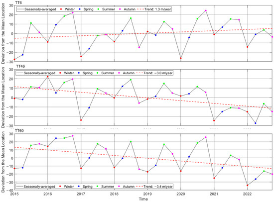Figure 10 shows the temporal variations of the shoreline location at the three transects, TT6, TT46, and TT60, from 2015 to 2022. Clear patterns of variations over multiple time scales are seen. The seasonal fluctuation typically conformed to a distinct pattern, characterized by shoreline advancement during the summer months (depicted by green circles, averaged across June, July, and August) and recession during winter (represented by red circles, averaged across December, January, and February). During the summer, the onshore transport of sediment under calm wave conditions increased the beach width. Conversely, in winter, the intensified waves induced seaward sediment transport, which resulted in a narrower beach. This seasonal pattern was consistently observed across all three transects (TT6, TT46, and TT60) in Figure 9. Commonly, the shoreline have undergone a relatively large shoreline retreat in the winter of 2017 and 2021.