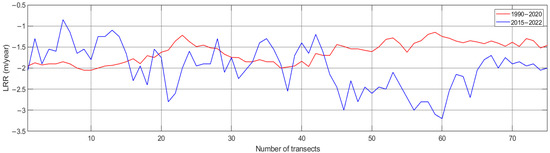 The LRR from 1990 to 2020 is also included in the figure for comparison. In the long term, the LRR had two peaks at TT23 and TT59. The maximum retreat was observed around TT9 and TT38. The pattern of alongshore distribution and the magnitude of LRR changed significantly recently. The LRR for the 2015–2022 period displayed pronounced alongshore variability compared to the 1990–2020 period. The erosion rates in TT1 to TT15 or TT27 to TT43 have been mitigated recently. In contrast, the erosion rate between TT15 to TT27 and especially between TT44 to TT60 became significant recently. The comparison indicated that the shoreline retreat area has been enlarged, and the recession rate has been accelerated. Accordingly, it is deducted that the erosion in Tam Tien Beach has become more serious recently. However, an eight-year observation is insufficient to evaluate the decadal trend accurately. Continuous monitoring and analysis are needed to clarify and anticipate future variations in shoreline change rates.