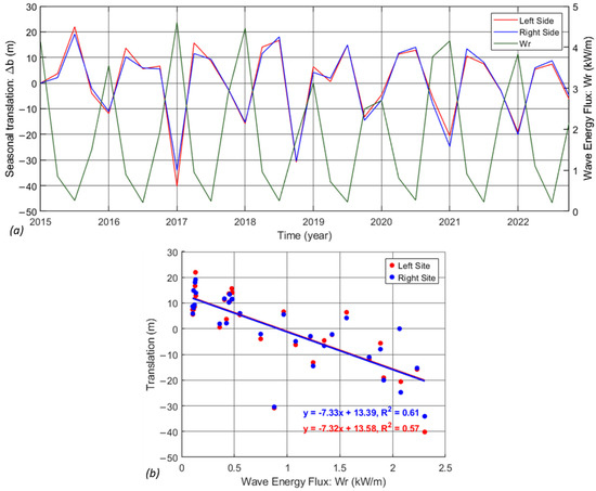 In Figure 13a, the seasonal variation of Wr is also included for comparison. The results demonstrated a negative correlation between Δb and Wr. This can be confirmed in Figure 13b. The figure further emphasized the similarity in the relation between Wr and shoreline translation on both sides. Negative translation values, indicating shoreline erosion, were most pronounced during winter (or fall) when Wr was high. In contrast, positive translation values reflected shoreline accretion in summer (or spring) when Wr was low. The results indicated that the seasonal variations of shoreline translation are driven by the natural processes of changes in Wr and the resulting variation in the cross-shore sediment transport direction.