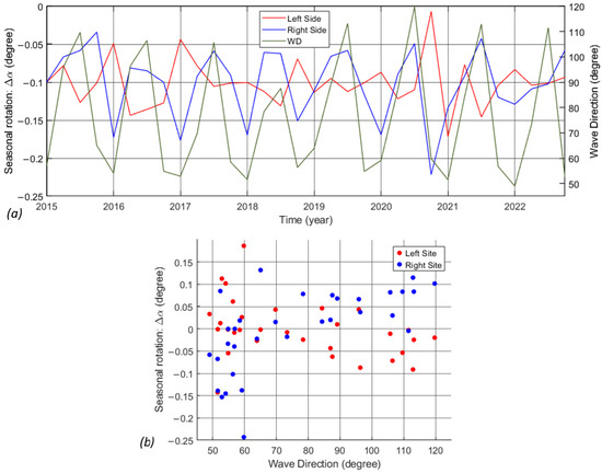 The variation of Δα in both sub-regions is plotted in Figure 14. On the right side, relatively regular seasonal variations were repeated. Generally, Δα on the right side was typically positive (clockwise rotation) in spring-summer, while it became negative (counterclockwise rotation) in fall–winter. It generally varied in the range of −0.15 to 0.1 degrees. The maximum positive peak of Δα was observed in the fall of 2015 over 0.1 degrees. The peak of counterclockwise rotation was seen in the fall of 2020, reaching nearly −0.25 degrees. Generally, the magnitude of negative peaks was more prominent than positive ones. This is because the wave energy is stronger in winter when the rotation angle on the right side becomes negative.