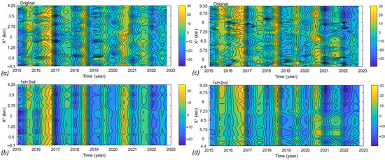Comparison of observations by CoastSat and corresponding EOF representations. The contour color represents the demeaned shoreline location (the deviation from the mean shoreline position at each transect): (a) original observations on the left side; (b) variation reconstructed by the summation of the first and second eigenmodes on the left side; (c) original observations on the right side; (d) variation reconstructed by the summation of the first and second eigenmodes on the right side.