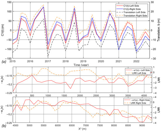 The alongshore distribution of LRR (computed for direction) for 2015 to 2022 is compared with e1 in Figure 16b. On the left side, the alongshore variation of LRR was relatively small. Although it varied from −2 to 1 m/year, the magnitude was relatively stable at around −0.5 m/year. Fluctuations with positive peaks were noticeable around X* = 800 m and 2200 m. The rate of shoreline retreat became large around—1 m/year in the area X* = 2800 m. Such a pattern of alongshore change in LRR and −e1 was generally similar. On the right side, the alongshore variation of LRR was apparent. It varied in the range of −3.5 to 0 m/year. It fluctuated from −1 to 0 m where X* < 6700 m but rapidly decreased from there. LRR in the area X* > 7200 m fluctuated around −2.5 m/year, and the erosion was most accelerated in the area X* > 8200 m around −3 m/year. The variation of -e1 indicated similar features, but the peak locations or decreasing patterns differed.