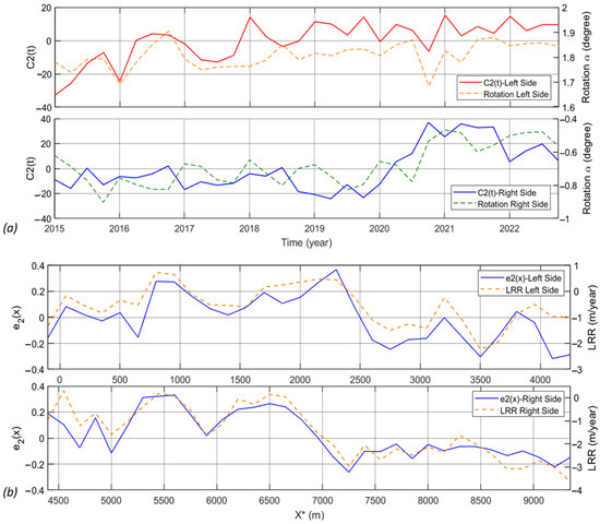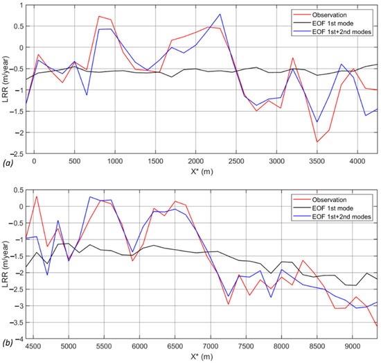 The spatial eigenfunctions e1 and e2 indicated a moderate and significant correlation to the LRR, respectively, in Figure 16 and Figure 17. Accordingly, the contributions of the first and second modes to LRR distribution were further examined here. In the analysis, the shoreline variation was approximated by the summation of the first two dominant modes of EOF as
