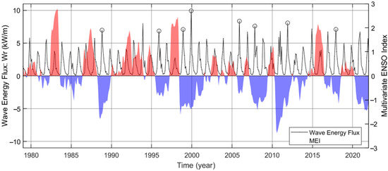 Climate indices, such as the bi-monthly Multivariate El Niño/Southern Oscillation (ENSO) index (MEI.v2), which tracks the leading EOF of five tropical Pacific variables, are widely recognized for their strong correlation with shoreline changes in various global regions [23]. Our preliminary analysis revealed that incoming wave properties in the study area align with MEI trends, prompting further examination of the MEI.v2 data provided by the Physical Science Laboratory of NOAA (National Oceanic and Atmospheric Administration; https://psl.noaa.gov/enso/mei/, accessed on 30 June 2024). The MEI.v2 index accounts for the seasonality of ENSO, integrating both oceanic and atmospheric variables, thus offering a comprehensive measure of ENSO’s impact on environmental conditions [31]. In this study, the correlation between the high wave energy flux Wr and the MEI index was explored, followed by a discussion of potential future influences on shoreline dynamics due to climate change.