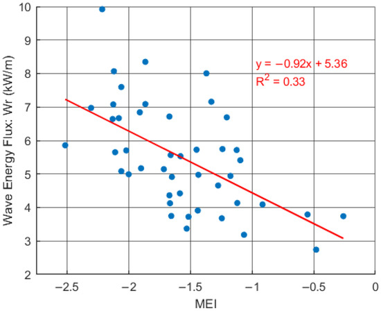 Relation between annual-peak wave energy flux and MEI index at that time.