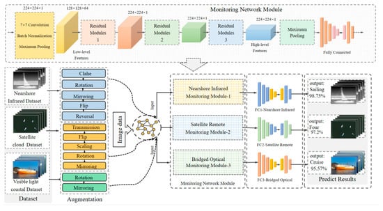 This section introduces a multi-source ship monitoring system, known as the resnet34-based knowledge transfer ship monitoring system (TRI-VSS), which supports ship detection across visible light coastal, satellite cloud, and infrared spectrum images while incorporating knowledge transfer techniques. As shown in Figure 1, the system consists of three key modules: a visible light coastal monitoring module, a satellite cloud monitoring module, and an infrared spectrum monitoring module. First, the raw images captured by conventional cameras, satellites, and infrared devices undergo respective preprocessing steps and are then fed into their corresponding module branches. Next, these branches independently perform training and validation on the image data to extract high-level features. Finally, the system outputs ship monitoring information from the three branches, providing the detected ship type or quantity. The proposed TRI-VSS system achieves high accuracy in monitoring visible light coastal, satellite cloud, and infrared spectrum data, enabling true round-the-clock, all-weather surveillance. This effectively addresses issues related to incomplete port monitoring data and inaccurate ship type matching.