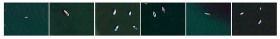 Figure 4 shows an aerial dataset collected from https://www.kaggle.com/andrewmvd/ship-detection (accessed on 1 June 2021) by aerial devices over real marine environments. The ship in the images is already labeled. It would, thus, enable the determination of vessel counts with exactness for model training and evaluation that are intended for vessel count prediction at ports. These images provide important data when seeking model performance improvement in maritime surveillance and vessel detection tasks. The scaling ratio between the sample image and the real image is 0.155.