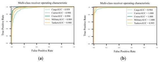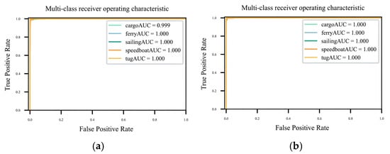 ROC curves for the visible light coastal dataset. (a) The original dataset and (b) the dataset after knowledge-guided augmentation.