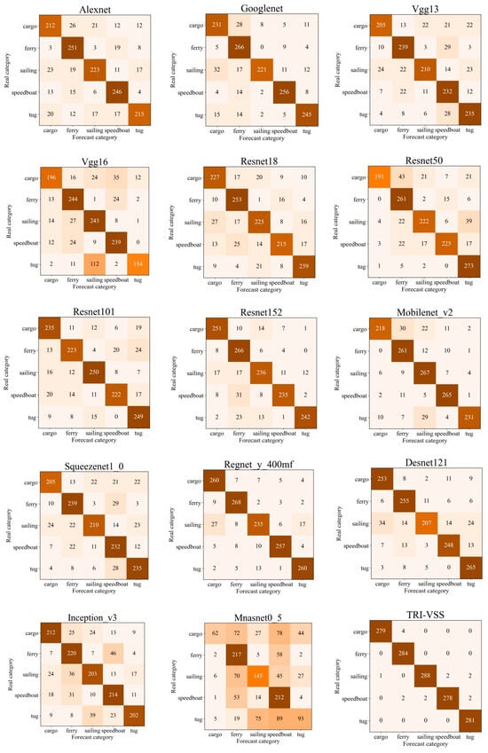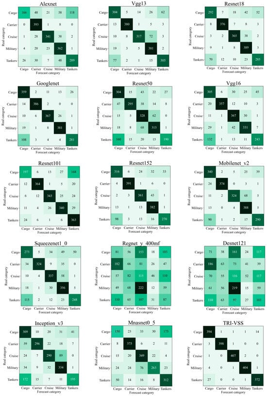 To comprehensively evaluate the performance of both traditional models and our proposed model in ship image recognition tasks, we used confusion matrices to analyze them. A confusion matrix is a two-dimensional table that displays the classification results across different categories. We input test images into the model for prediction and compared the predicted results with the ground truth labels. By counting each category’s position in the confusion matrix, we can determine the model’s prediction accuracy for each category. In the confusion matrix, we focus on four metrics: True Positive (TP), True Negative (TN), False Positive (FP), and False Negative (FN). Analyzing these matrices reveals that the TRI-VSS system demonstrates superior overall recognition performance compared to other well-known models. It achieves satisfactory recognition accuracy with minimal variance across different ship categories. In contrast, other well-known networks show significant differences in recognition accuracy for different ship categories. For instance, in the visible coastal data monitoring, the AlexNet model achieves 70.22% accuracy for the Cargo category and 97.76% accuracy for the Carrier category. In comparison, the TRI-VSS system achieves 95.86% accuracy for Cargo and 99.00% for Carrier. The deeper color along the diagonal of the confusion matrix indicates better model performance. As shown in Figure 9, Figure 10 and Figure 11, the TRI-VSS model’s confusion matrix exhibits a darker central line, indicating better overall classification results, while other models show less satisfactory performance. Nevertheless, our model still encounters misclassifications, indicating potential areas for further improvement in classification algorithms.