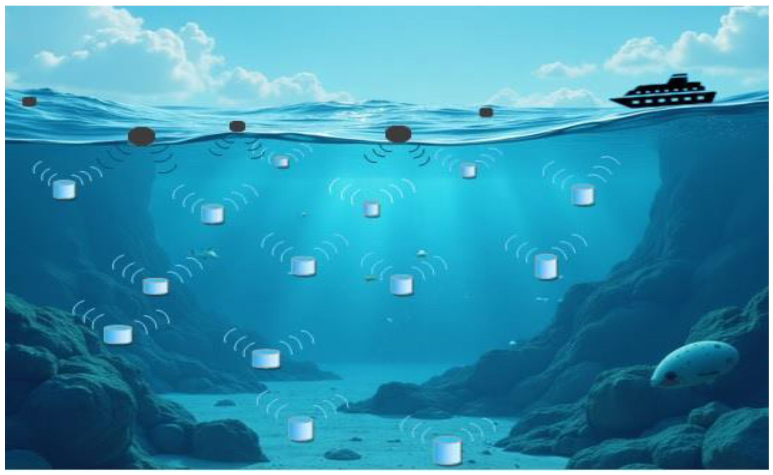 - Shakila, R.; Paramasivan, B. An improvised optimization algorithm for submarine detection in underwater wireless sensor networks. Microsyst. Technol. 2024, 30, 185–196. [Google Scholar] [CrossRef]