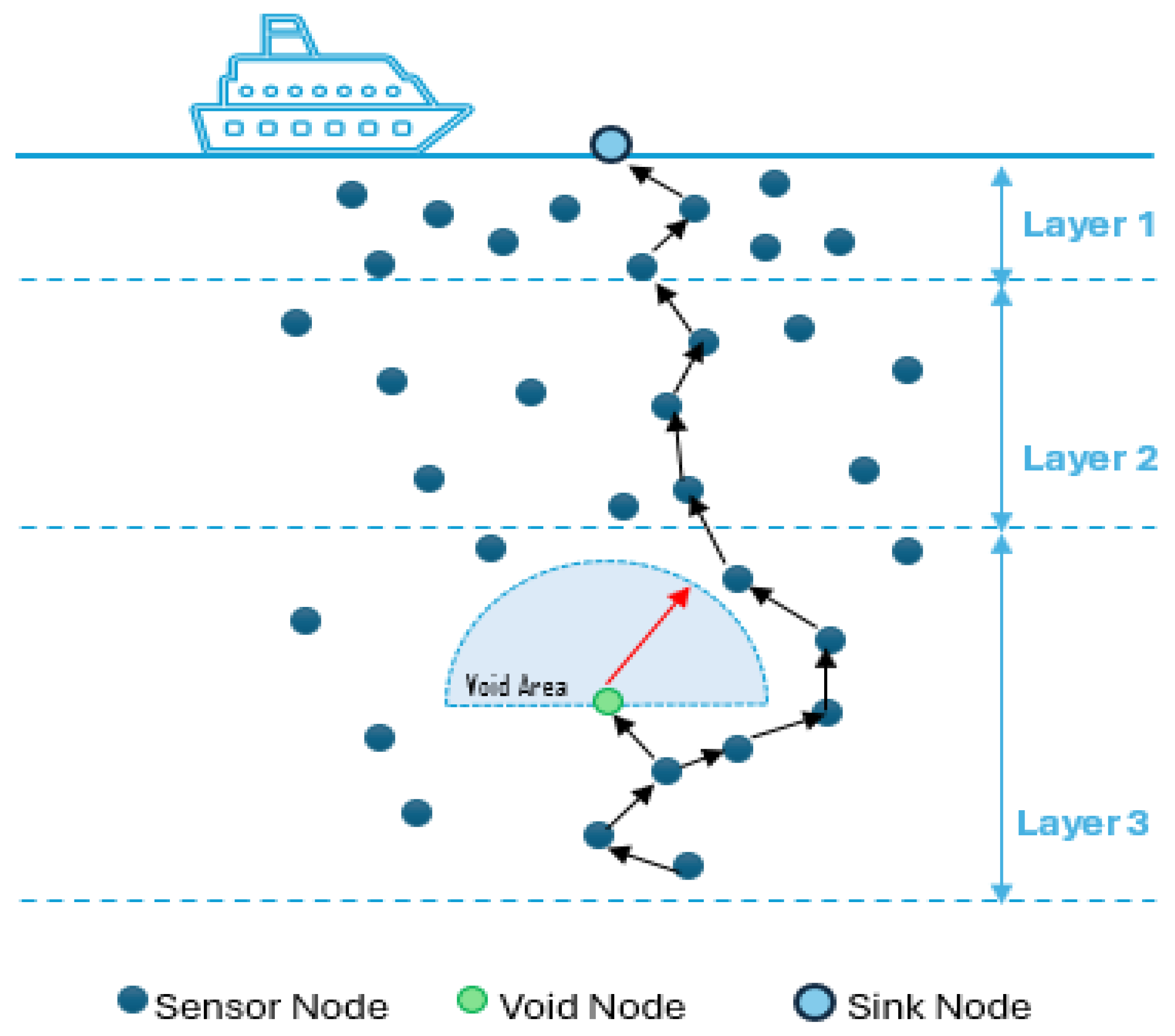 - Karim, S.; Shaikh, F.K.; Chowdhry, B.S. Void Handling in Routing Protocols for Underwater Wireless Sensor Networks: A Quantitative Analysis. In Proceedings of the 2021 IEEE 18th International Conference on Smart Communities: Improving Quality of Life Using ICT, IoT and AI (HONET), Karachi, Pakistan, 11–13 October 2021; pp. 137–142. [Google Scholar] [CrossRef]