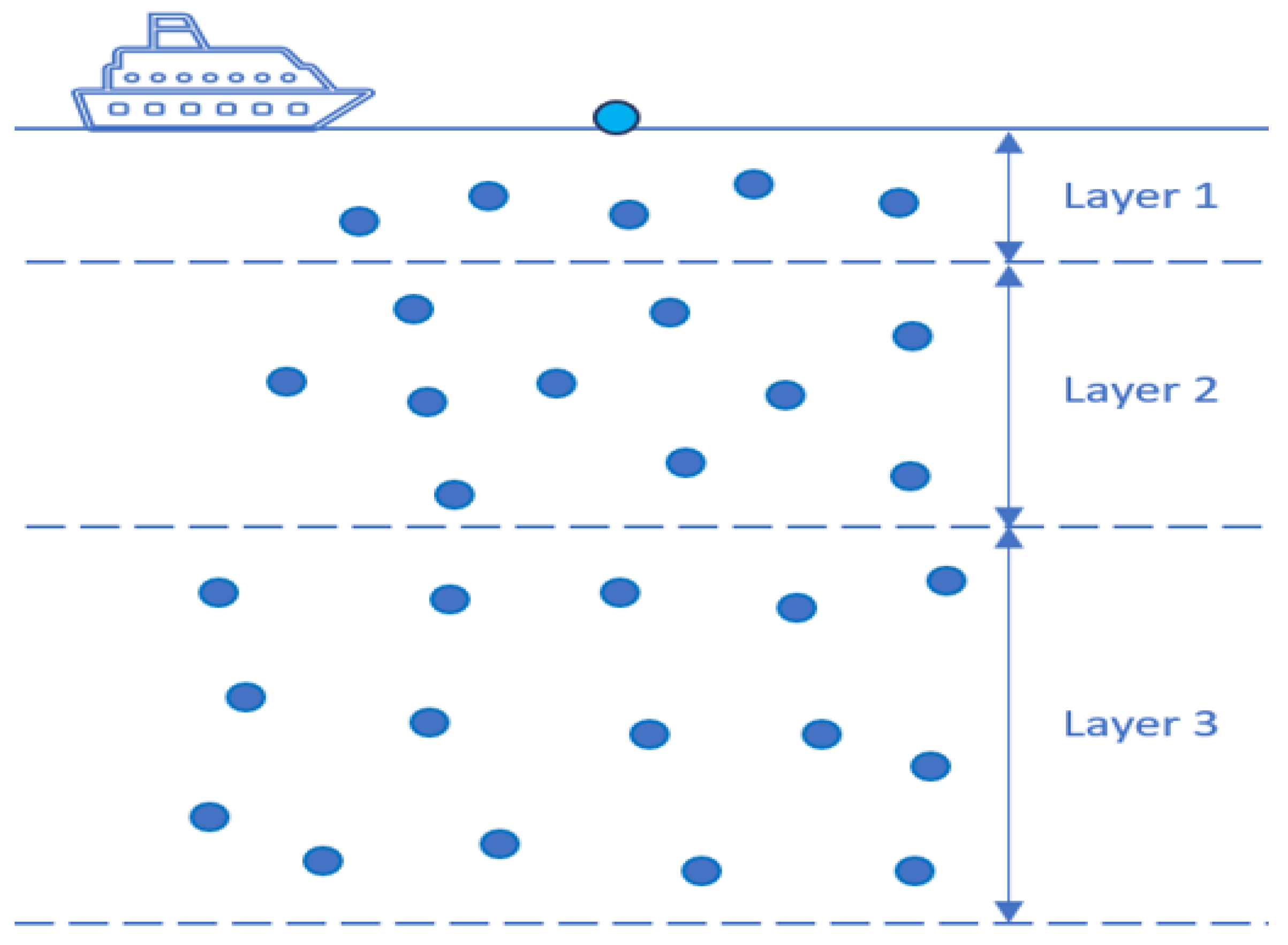 - Khan, W.; Wang, H.; Anwar, M.S.; Ayaz, M.; Ahmad, S.; Ullah, I. A Multi-Layer Cluster Based Energy Efficient Routing Scheme for UWSNs. IEEE Access 2019, 7, 77398–77410. [Google Scholar] [CrossRef]