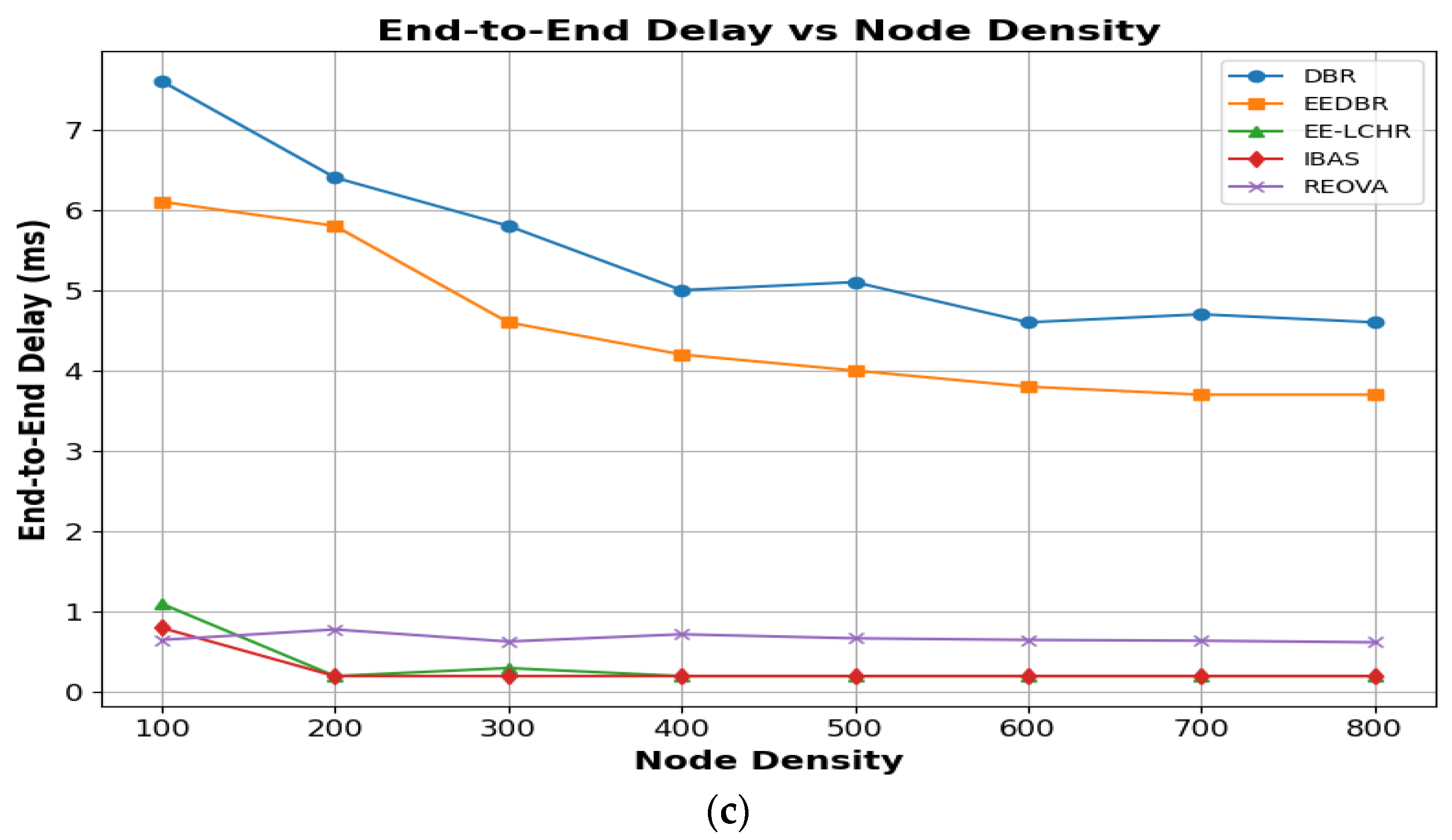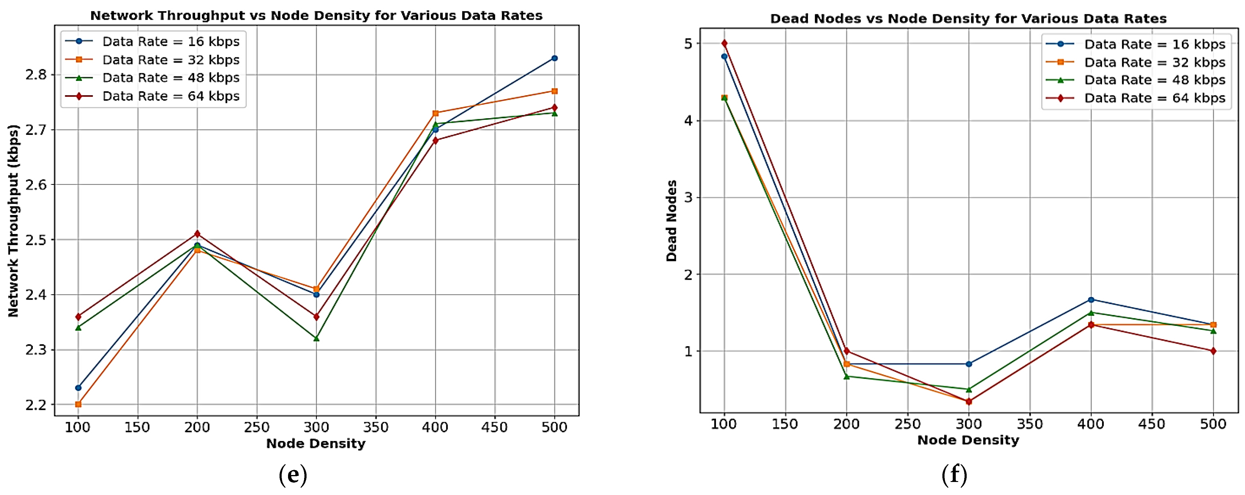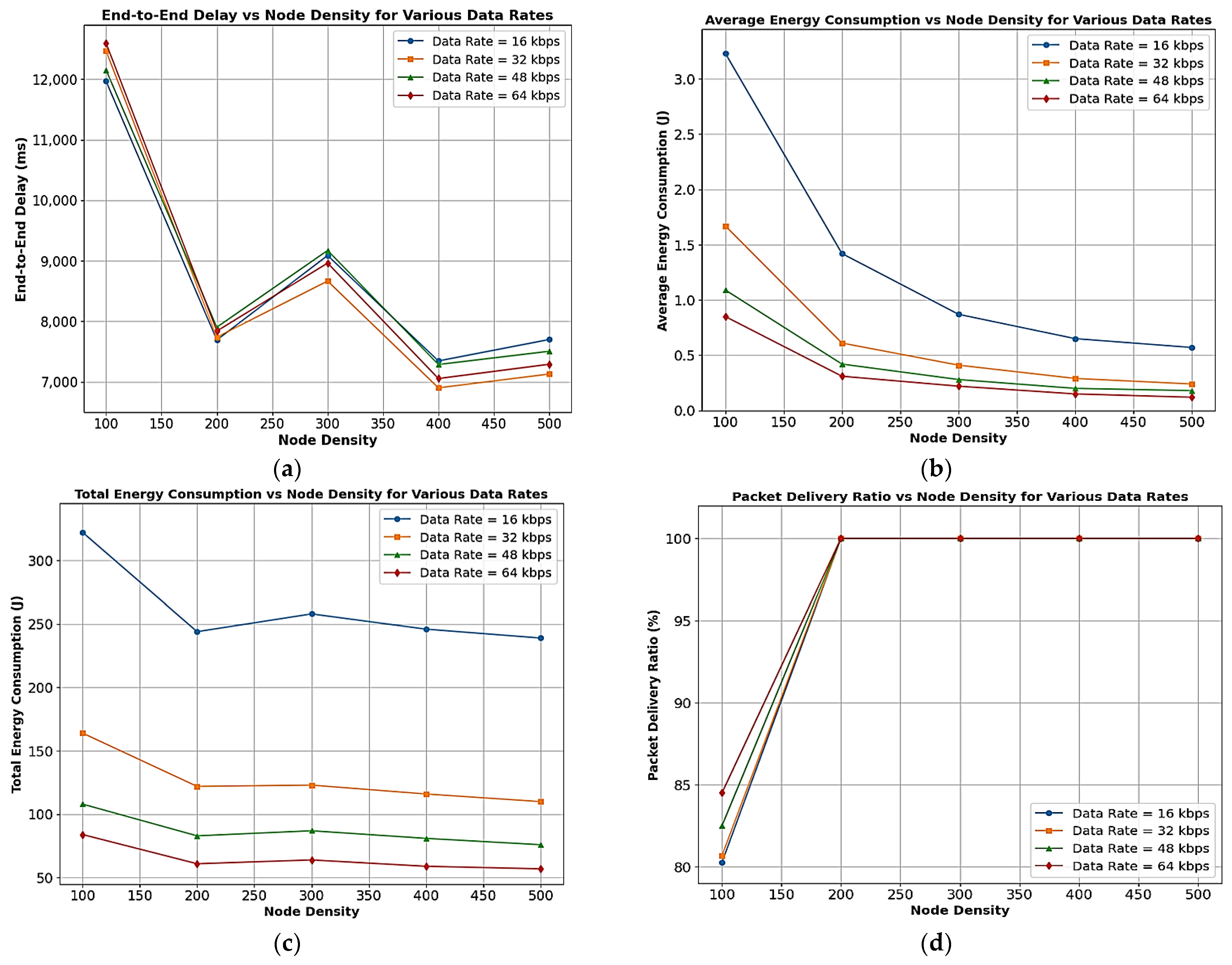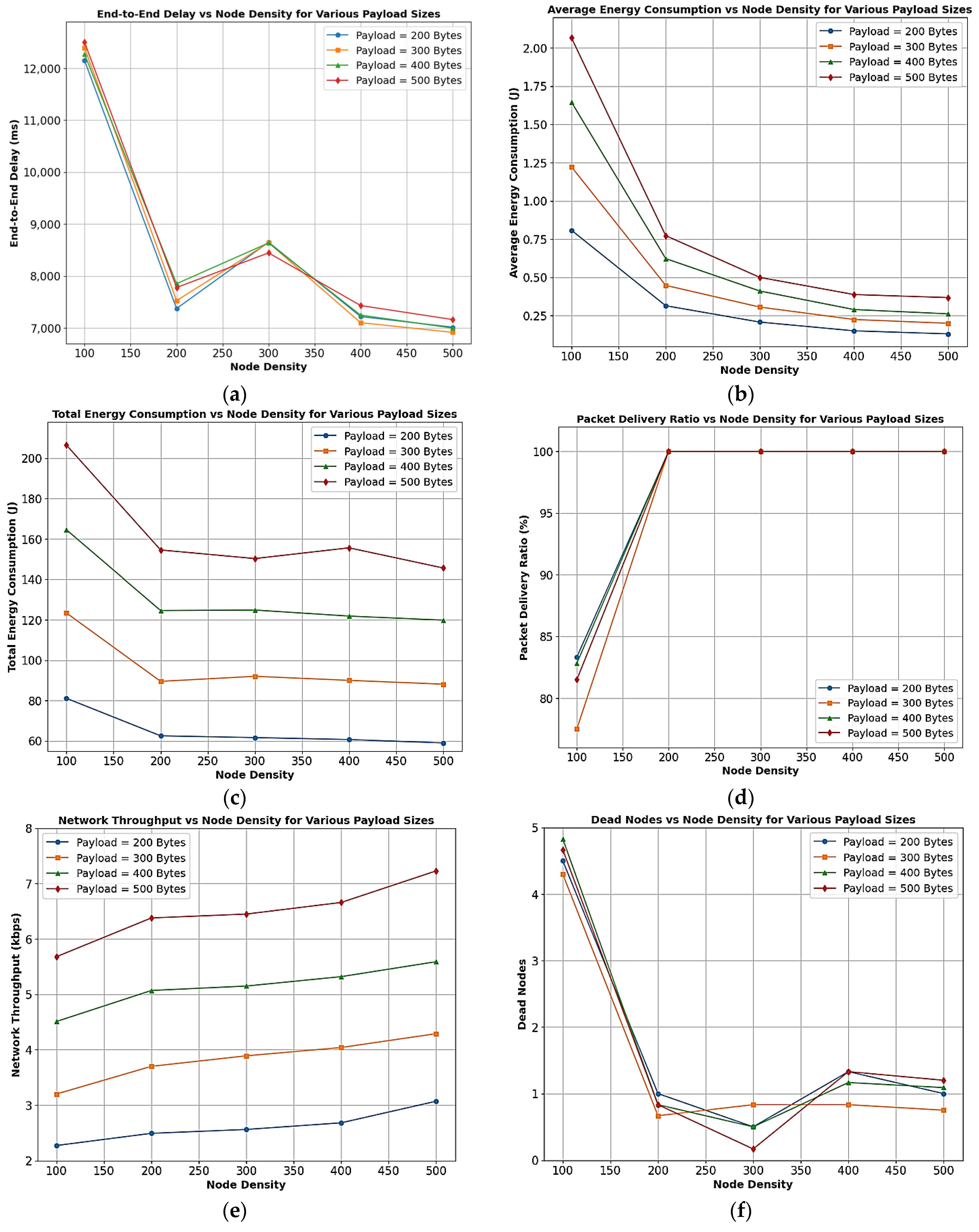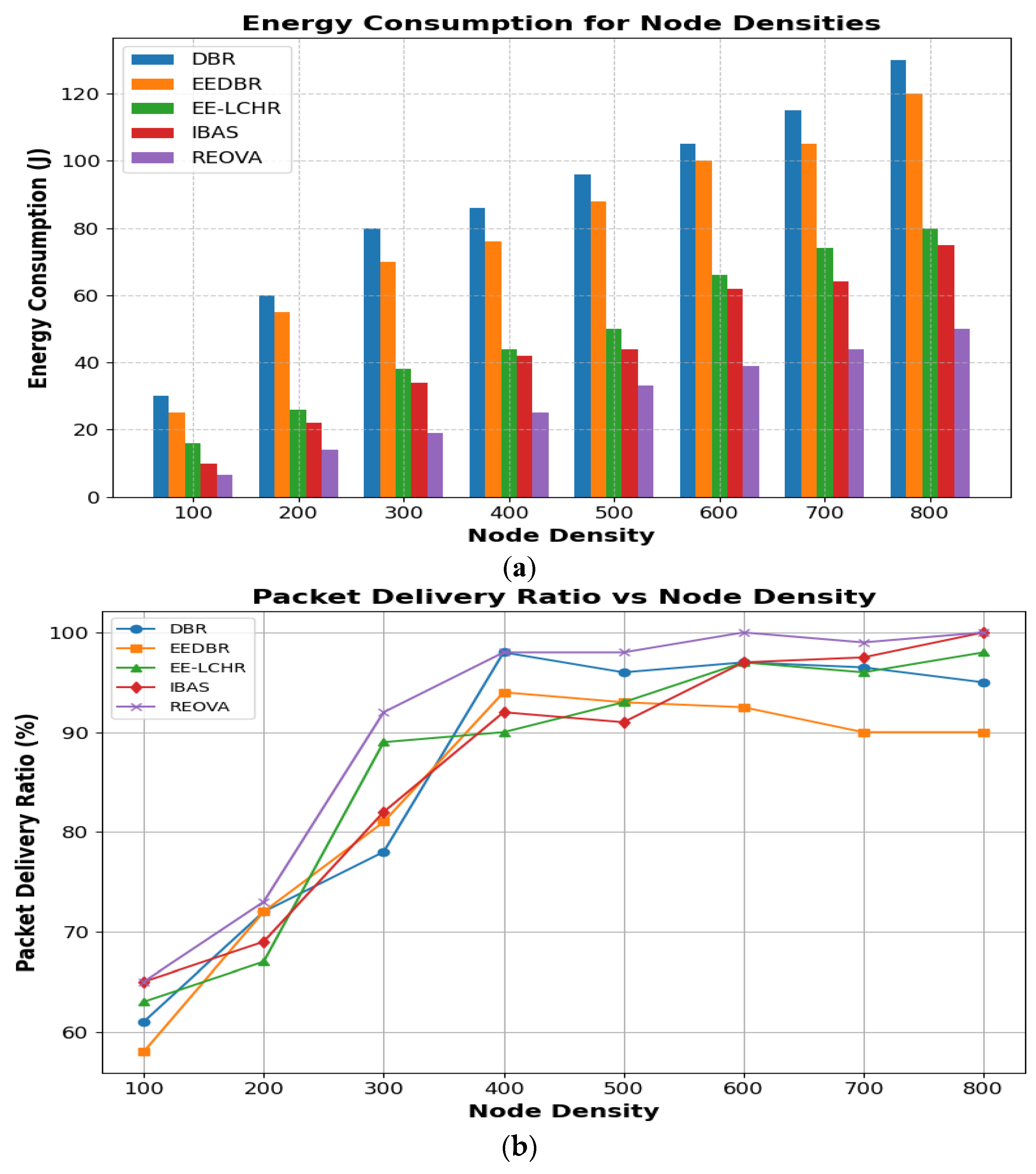 | VAPR [34] | Geo-opportunistic routing with explicit beaconing technique to avoid void areas | Random deployment | Improved PDR | High energy consumption, increased E2ED |