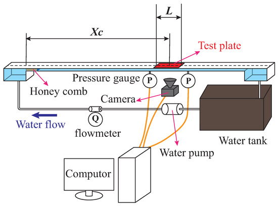 The schematic of the water tunnel where the experiments are conducted is presented in Figure 1. The water tunnel is comprised of two settling chambers, the upstream chamber and the downstream chamber. These two chambers are used to suppress the turbulence and pressure fluctuation in the tunnel. The length, width, and height of the chambers are 60 mm, 40 mm, and 40 mm, respectively. In order to break the vortexes flowing into the tunnel, a honeycomb is connected next to the upstream chamber. The tunnel between those two chambers is 1320 mm long and its cross-section is square. The width and height of the tunnel are 40 mm and 10 mm, respectively. The distance between the entrance of the tunnel and the center of the test plate is mm. This distance is reserved for the development of the turbulent boundary layer. The test plate is 240 mm long and 34 mm wide. The test plate is fixed on the upper wall of the tunnel and faces downward. The buoyancy experienced by the air points upward and prevents the air from leaving the grooves.