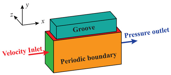 The numerical simulation was performed with the Ansys Fluent 2021 R1. The computational domain of the numerical simulation is presented in Figure 3. It is impossible to perform computation on the domain which is the same as the samples used in the experimental measurement. The reason is that the samples used in the experimental measurement comprise dozens of grooves. If the computational domain of the experimental samples is used, the grid quantity might comprise hundreds of millions of elements. The huge number of grid elements requires an extremely excellent computer to accomplish the calculation. Thus, it is impossible to perform the calculation on the domain which is the same as the samples used in the experimental measurement. The computational domain used here is a single groove. The boundary conditions applied here are velocity inlet, pressure outlet, and periodic boundary for the front and back wall. The other walls are set as no-slip boundaries. The gravity is on the −y-axis. The velocity inlet was calculated from a channel with the same cross-section as Figure 3. The calculated channel length is set as (the distance between the entrance of the water tunnel and the center of the test plate presented in Figure 2). The height of the computational domain is the same as the height of the water tunnel (10 mm). The length and width of the computational domain are the same as the groove dimensions used in the water tunnel experiment.