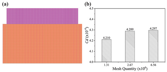 The structural mesh is applied here to improve the mesh quality (Figure 4a). All the meshes are cubes of the same size. The verification of the mesh independency is presented in Figure 4b. The smooth surface is used in the verification. The result shows that the mesh number of 2.76 × 106 and 6.56 × 106 exhibits the same drag coefficient, which indicates that the mesh density of 2.67 × 106 meshes is adequate for the computation accuracy.