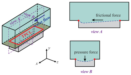 where the and the and the and the are the surface tension of the water and the unknown factors in the x direction and y direction and z direction, respectively. The and and are the unit vectors in the x direction and y direction and z direction, respectively. The unknown factors, the and the and the , are only decided by the shape of the air–water interface S and range from −2 to 2. On the right hand of Equation (11), the first term and the second term and the third term are the capillary force components in the x direction and y direction and z direction, respectively. For the flat or the symmetric air–water interface, these three factors will be 0. For the air–water interface shown in Figure 5view A, the will be negative, which means that the x component of the capillary force is in the direction. For the air–water interface shown in Figure 5view B, the will be positive, which means that the y component of capillary force is in the y direction.