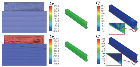 The pathline and phase field (left column), pressure coefficient (mid column), and friction coefficient (right column). The first row is the groove filled with water and the second row is the groove filled with air. In the left column, the water is represented by blue color, the air is represented by red color.